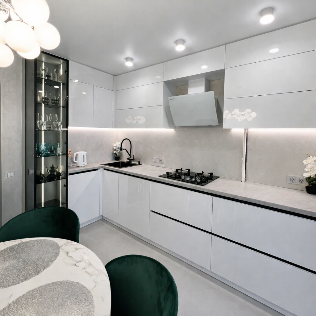 Угловая кухня в глянцевом белом исполнении с черными акцентами. Решение выглядит чисто, ярко и отлично отражает свет.