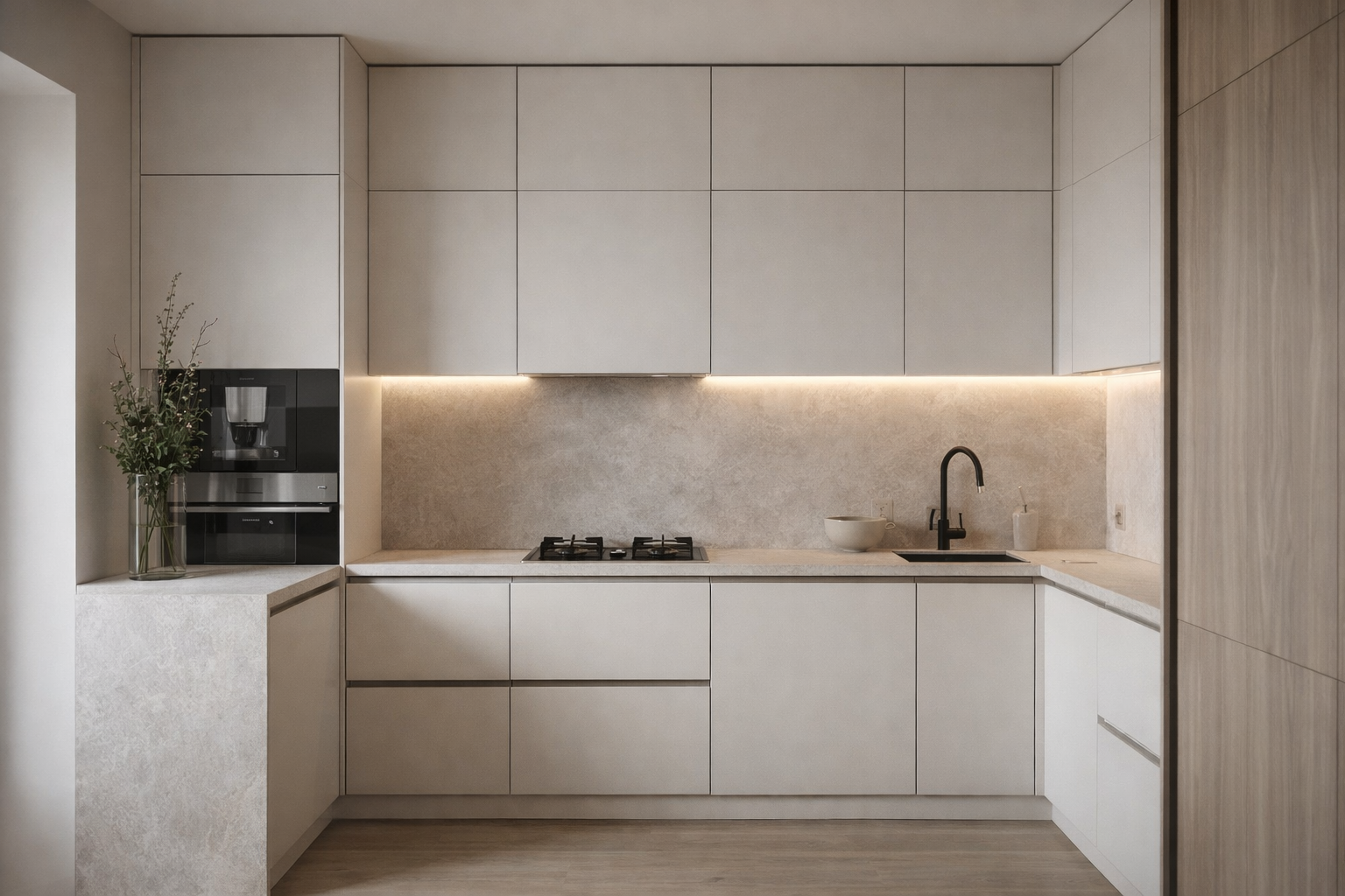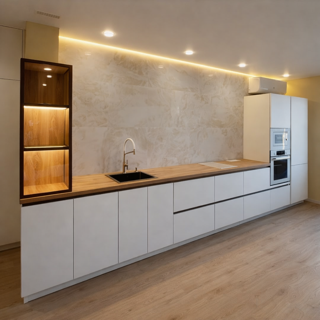 Проектируем кухни и встроенную мебель так, чтобы свет, материалы и геометрия собирались в спокойную цельную среду.